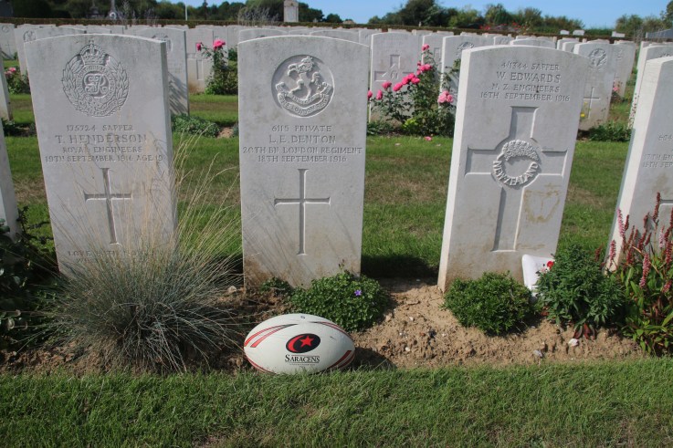 Though without a personalised epitaph on his own headstone, one of those graves immediately next to Private Louis Edward Denton’s carries the inscription “A glorious death is a living memory“….Let this stand as a poignant epitaph to another of our valiant Saracens who made the ultimate sacrifice in World War 1.
